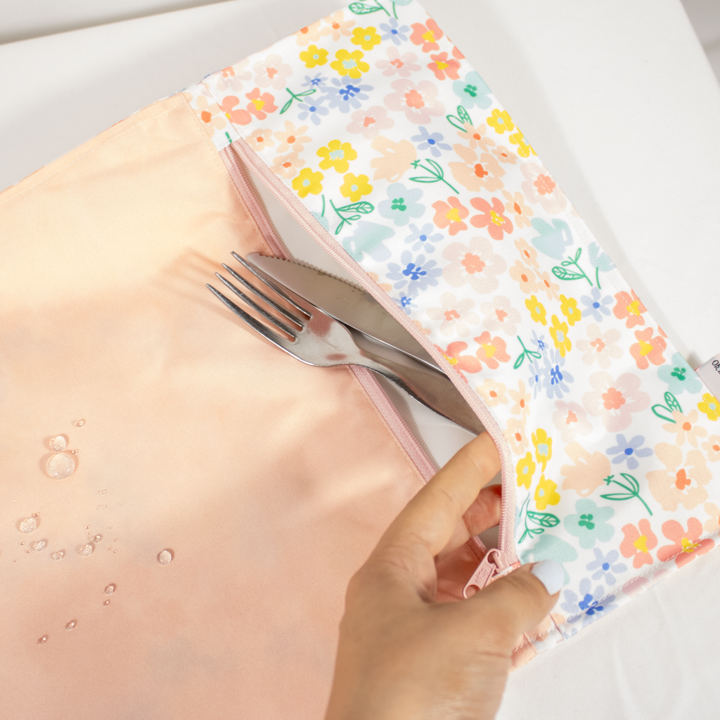 Com bolso interior para talheres. Assim, não caiem, nem ficam perdidos na lancheira.