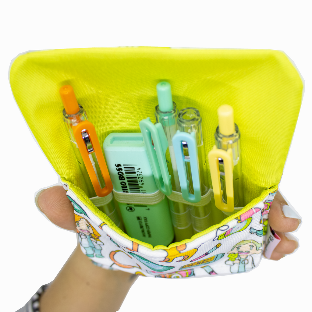 Tem um elástico no interior, para prender as tuas canetas e impedir que caiam todas no chão.