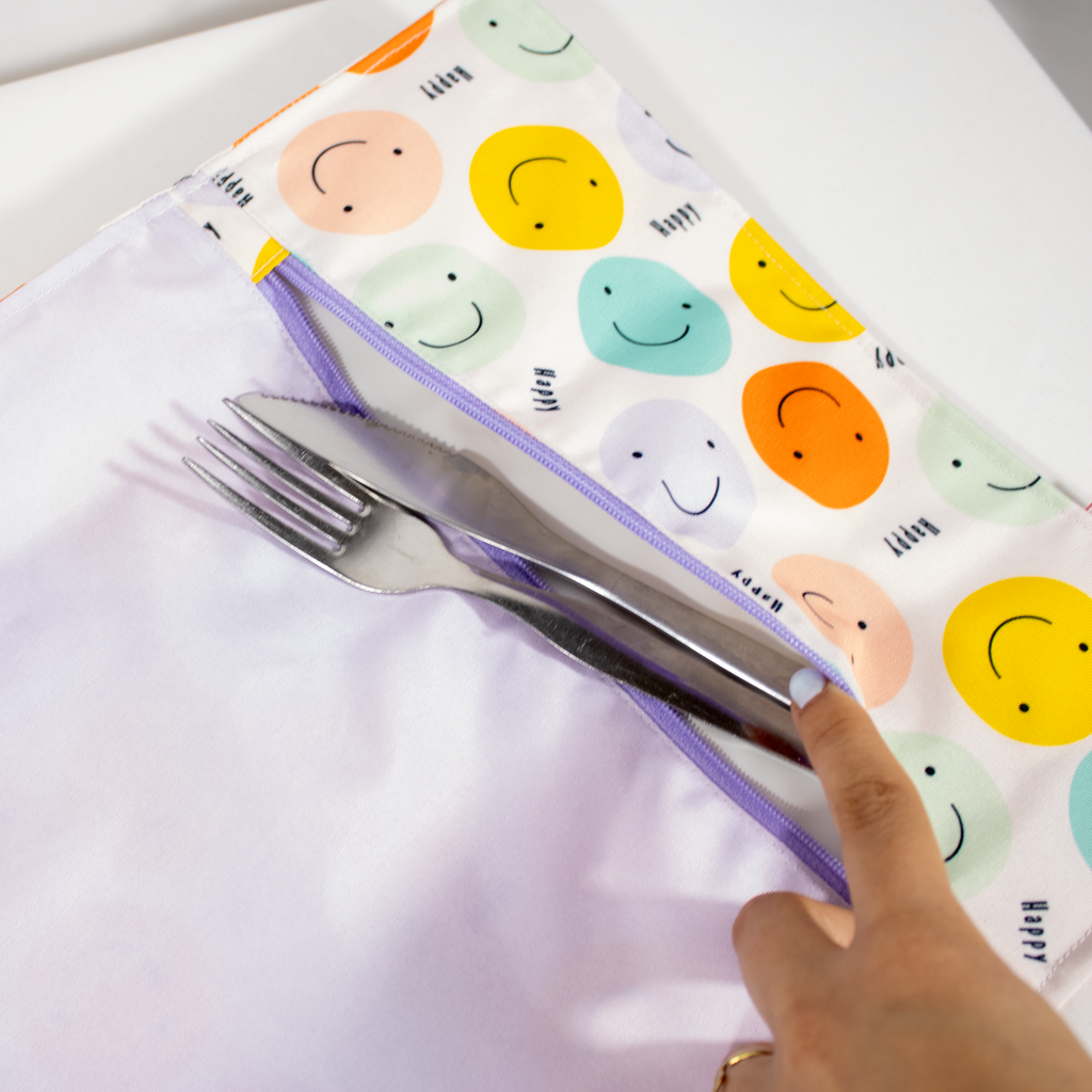 Com bolso interior para talheres. Assim, não caiem, nem ficam perdidos na lancheira.