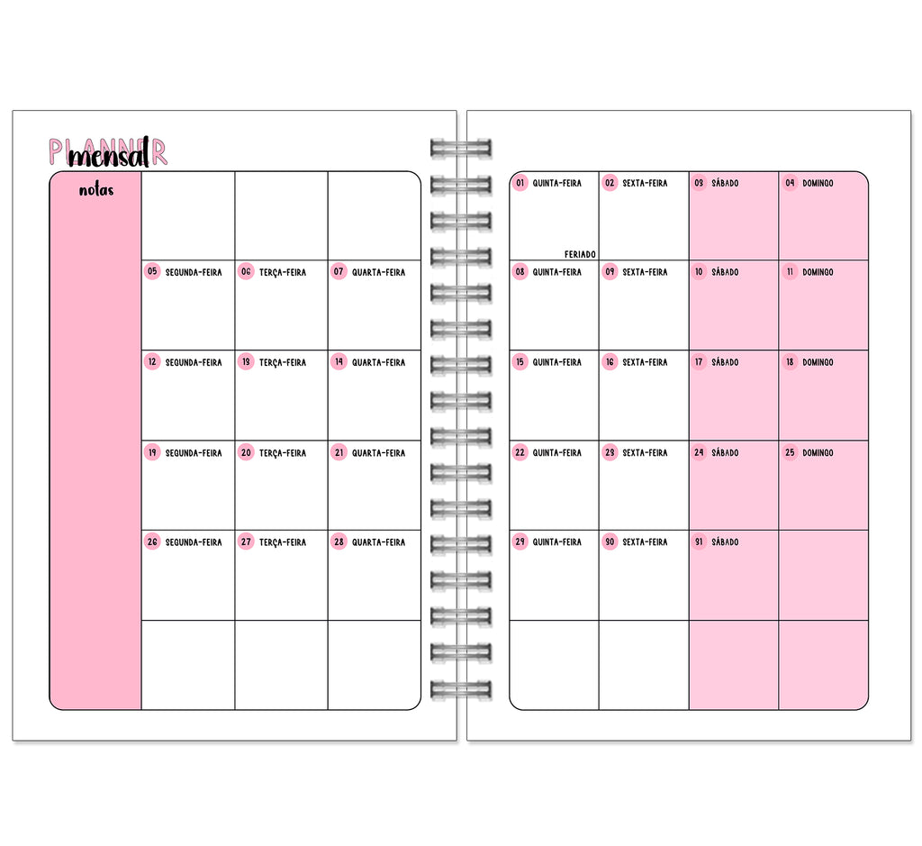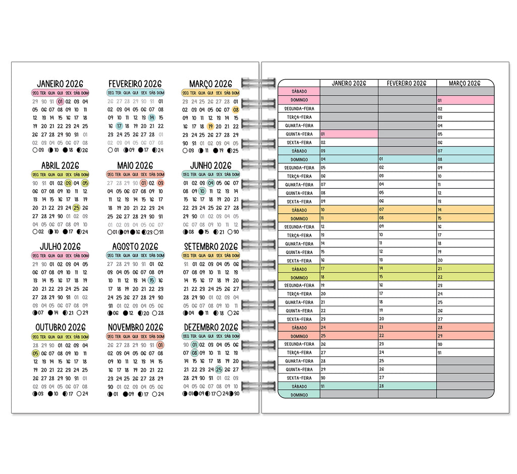Separadores mensais para facilitar o acesso a cada mês. Vista semanal, dividida em duas páginas, com linhas para facilitar o registo dos compromissos para cada dia.