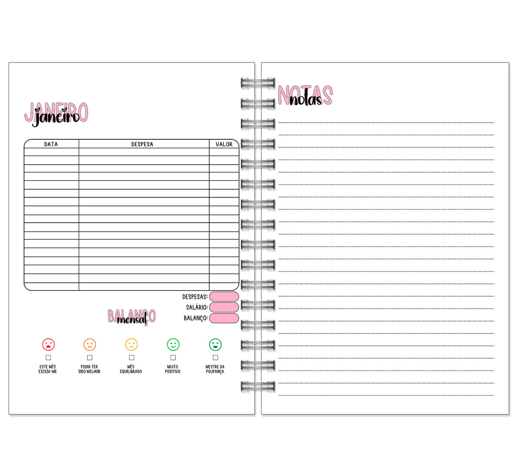 Separadores mensais para facilitar o acesso a cada mês. Vista semanal, dividida em duas páginas, com linhas para facilitar o registo dos compromissos para cada dia.
