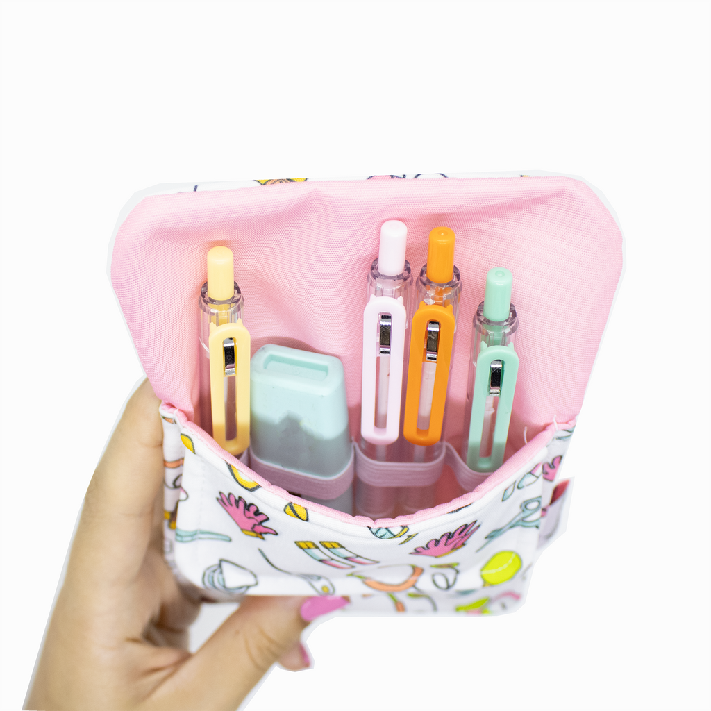 Tem um elástico no interior, para prender as tuas canetas e impedir que caiam todas no chão.